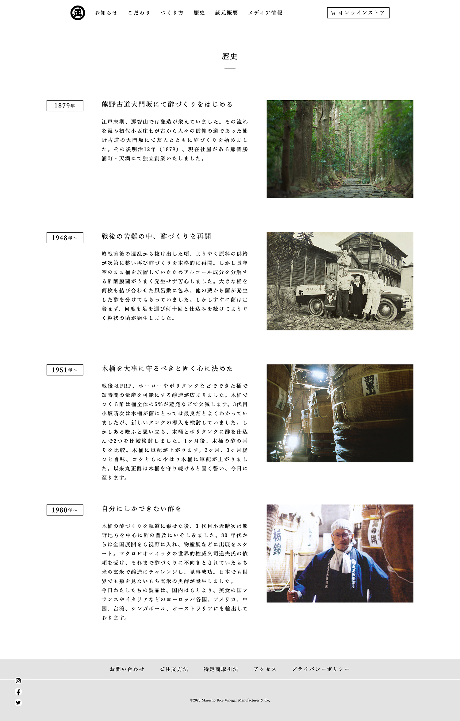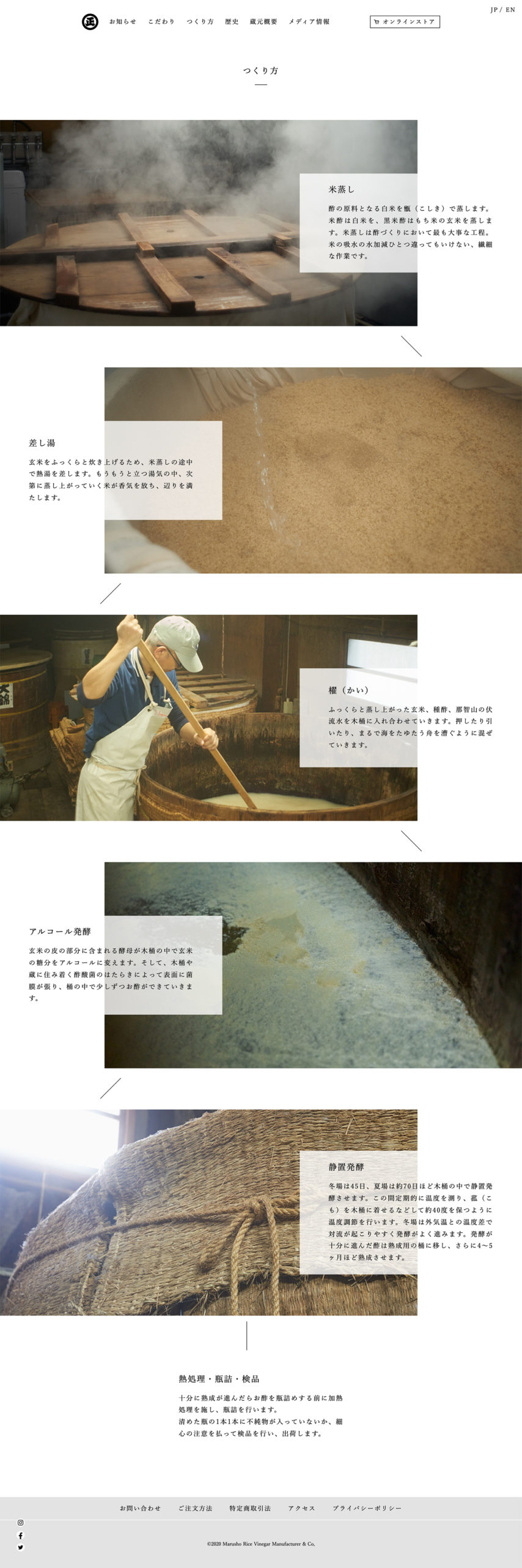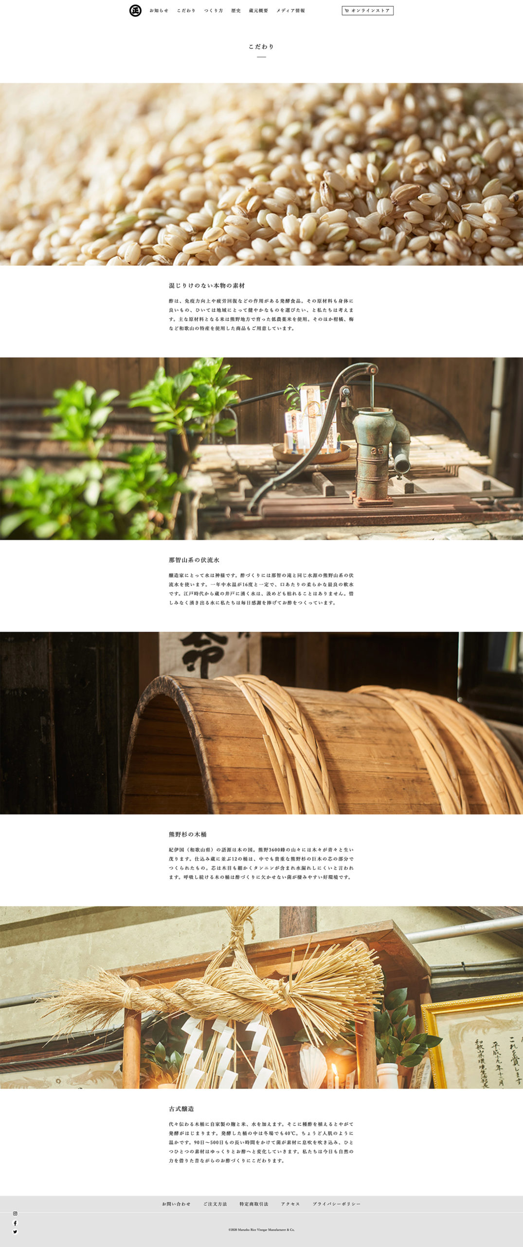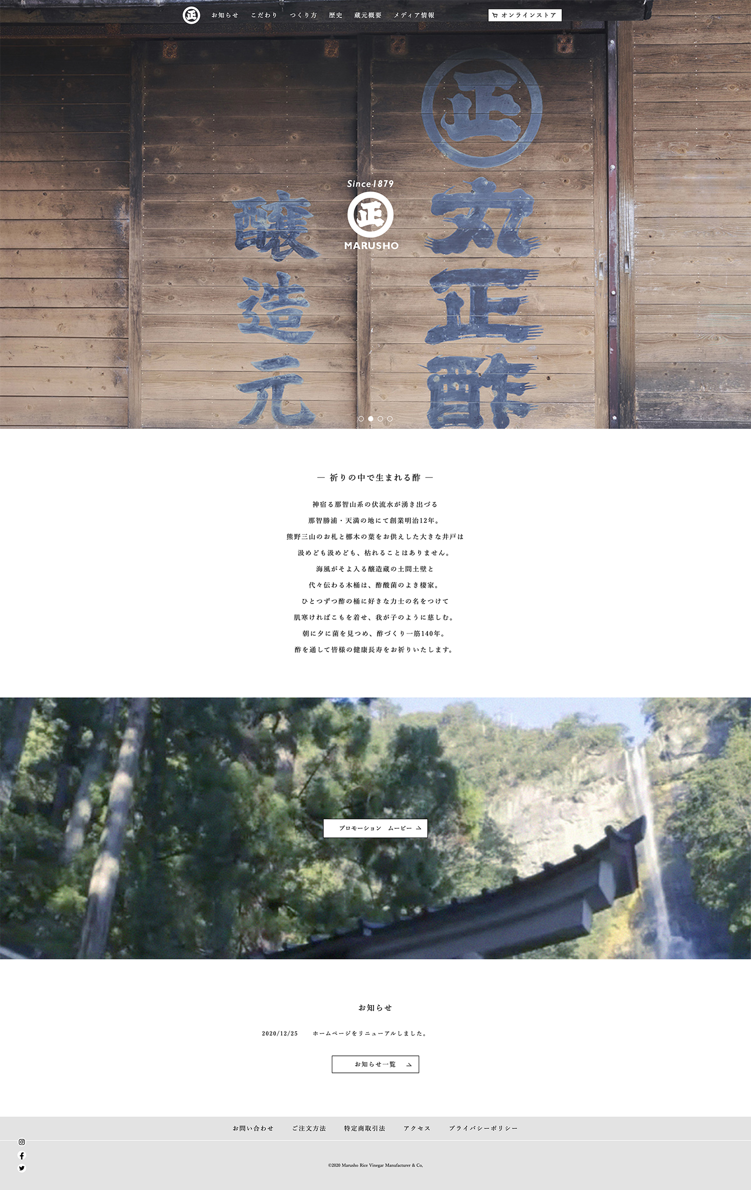 丸正酢醸造元のコーポレートサイト並びにECサイトのリニューアル。リニューアルに伴い、コンセプトワード及びアートディレクション全般を担当した。丸正酢醸造元は和歌山県那智勝浦町で、世界遺産那智の瀧と同じ水系の水でつくるお酢の蔵元。ウェブサイトの抜本的なリニューアルからスタートすることになった。既存サイトはコーポレートサイトとECサイトが一体となっていたが、サイトのコンテンツをていねいに整理することで、丸正酢が持つ歴史やものづくりにかける情熱など、クライアントのメッセージが明確になるように一新した。
